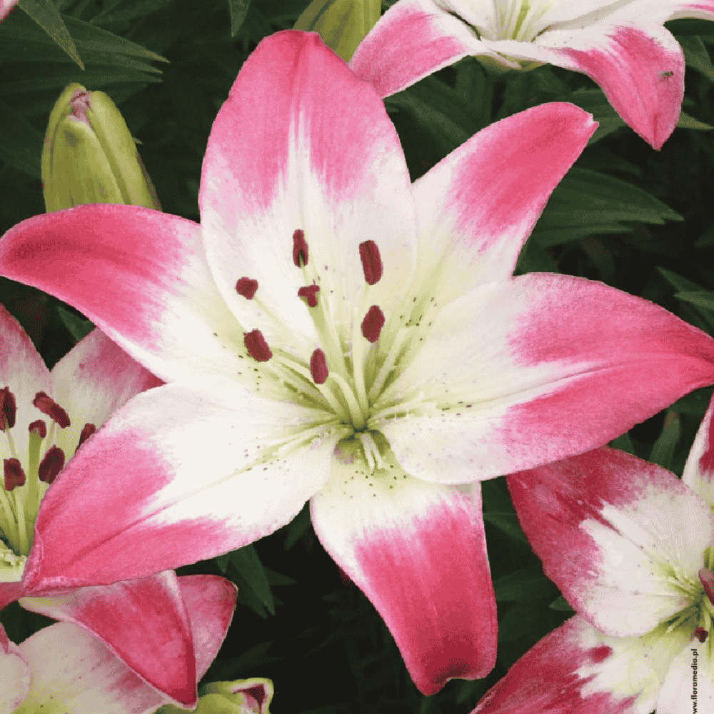 Lilia azjatycka Lollypop to urocza i dekoracyjna odmiana o pełnych, różowo-białych kwiatach, która wnosi do ogrodu lekkość i romantyczny akcent. Kwiaty są wielopłatkowe, pełne, z jasnoróżowym odcieniem na brzegach płatków i białym środkiem, co tworzy efektowny kontrast. Na jednym, mocnym pędzie rozwija się kilka kwitów, które długo utrzymują świeżość i dekoracyjny wygląd. Smukłe, ciemnozielone liście pięknie podkreślają pastelowy kolor kwiatów. Lilia Lollypop kwitni od lata do wczesnej jesienii i wyróżnia się stabilnymi, wyprostowanymi łodygami, dzięki czemu jest doskonała na rabaty,do pojemników oraz na kwiat cięty.