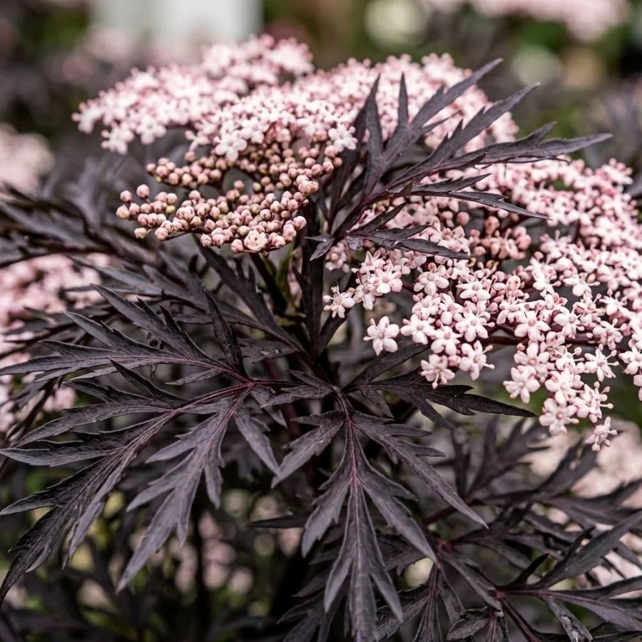 Bez czarny Black Lace - Sambucus nigra Black Lace to niezwykle dekoracyjny krzew o eleganckim, ażurowym ulistnieniu w głębokim, purpurowo-czarnym kolorze. Jego liście przypominają delikatną koronkę, dzięki czemu roślina wygląda bardzo lekko i efektownie przez cały sezon. Wczesnym latem (czerwiec–lipiec) krzew obsypuje się różowo-kremowymi, pachnącymi kwiatami, które pięknie kontrastują z ciemnym ulistnieniem. Jesienią pojawiają się czarne owoce, chętnie wykorzystywane na przetwory i soki. Black Lace to odmiana łącząca walory ozdobne i użytkowe, idealna do nowoczesnych i naturalistycznych ogrodów.