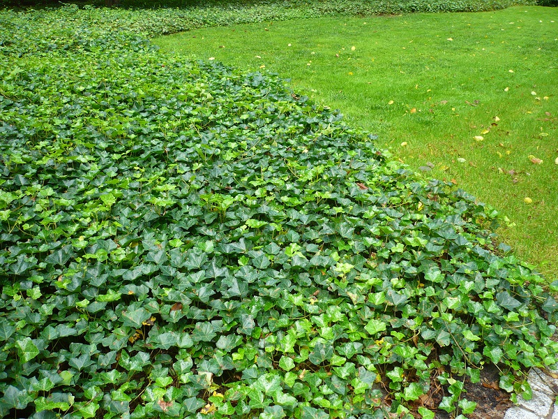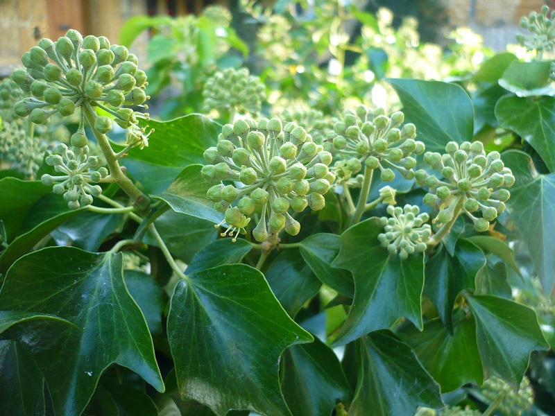Stare egzemplarze kwitną jesienią. Bluszcz, jeśli nie ma podpory, płoży się po ziemi zastępując trawnik.