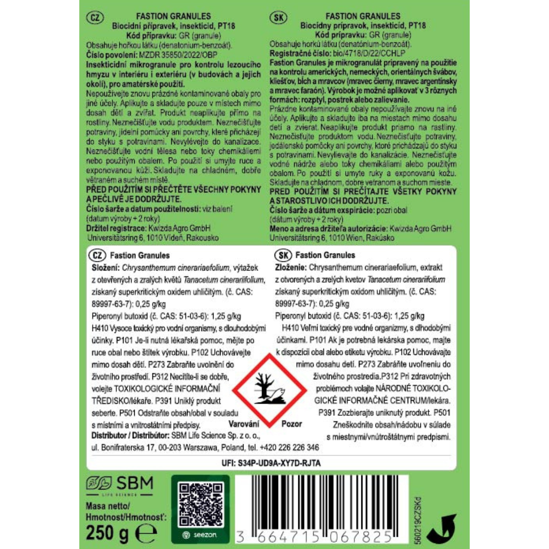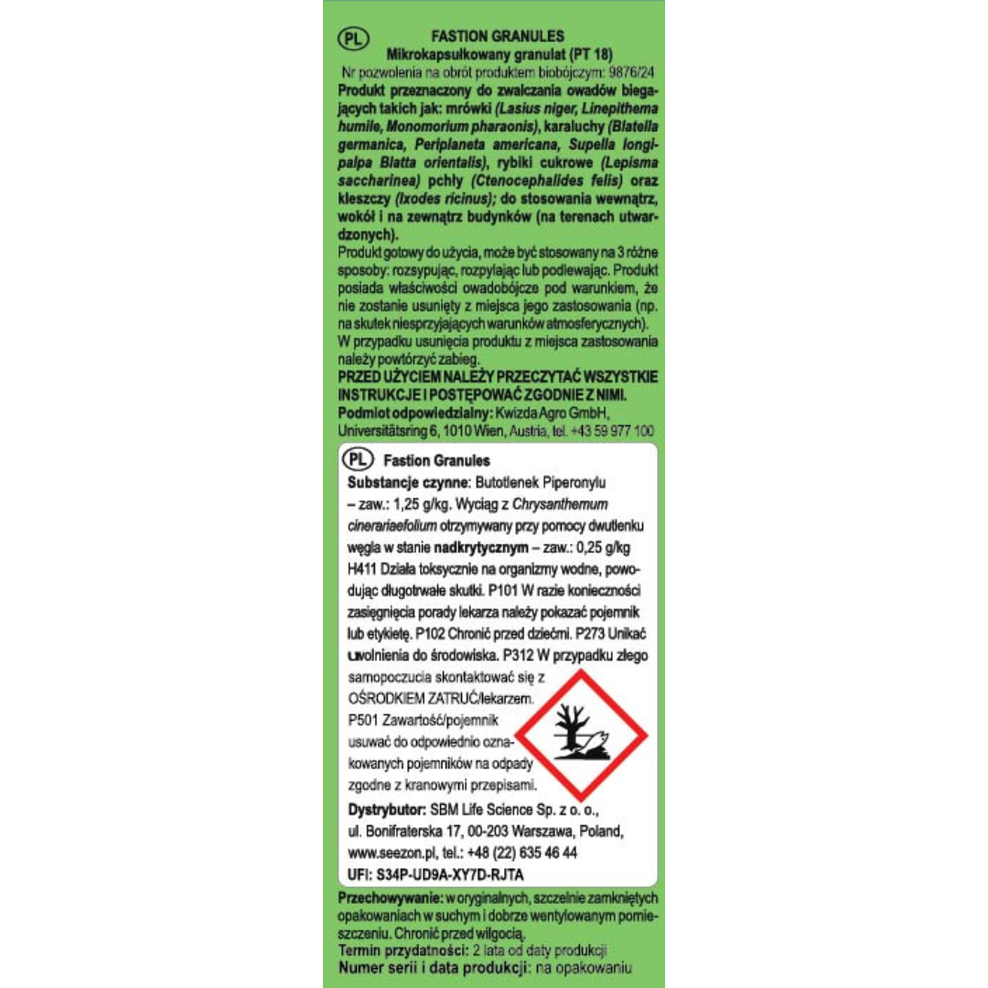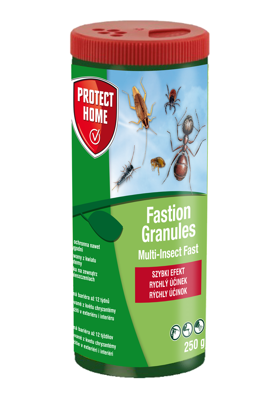 Fastion Granulki z Pyrepetryną Na Mrówki i Inne Szkodniki - to skuteczny, naturalny preparat do zwalczania owadów biegających, takich jak: mrówki , karaluchy, rybiki cukrowe, pchły oraz kleszcze. Produkt gotowy do użycia.