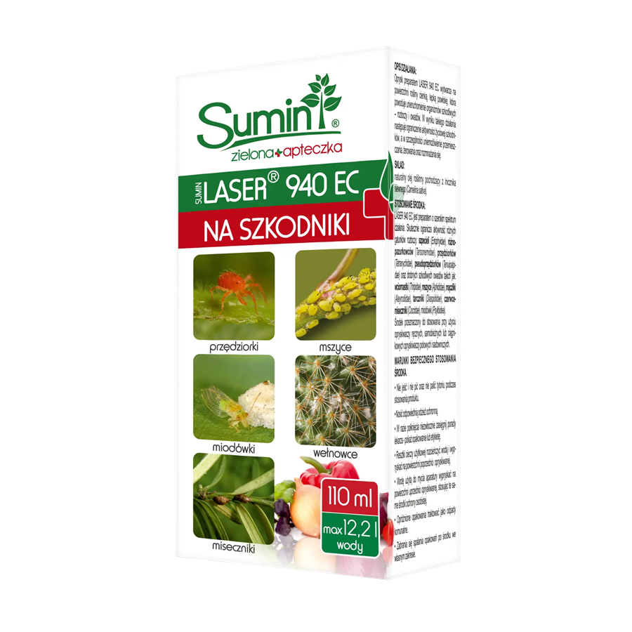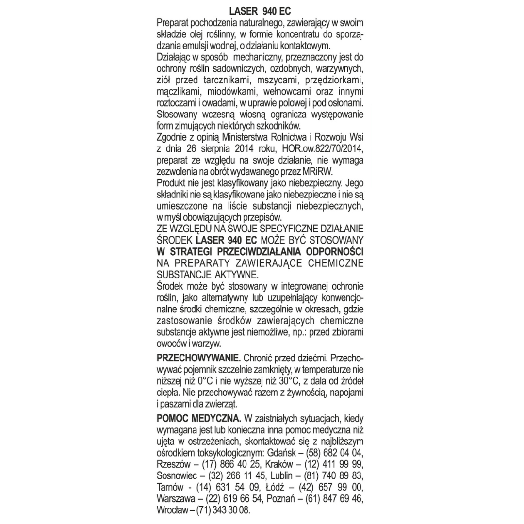 Laser 940 EC na szkodniki - to preparat pochodzenia naturalnego na bazie oleju roślinnego, w formie koncentratu do sporządzania emulsji wodnej. Działa mechanicznie i kontaktowo, tworząc powłokę ograniczającą aktywność szkodników (przemieszczania się, żerowania oraz rozmnażania). Stosowany wczesną wiosną pomaga ograniczyć populację zimujących form szkodników. Można go stosować za pomocą opryskiwaczy ręcznych, samobieżnych oraz opryskiwaczy polowych i sadowniczych.