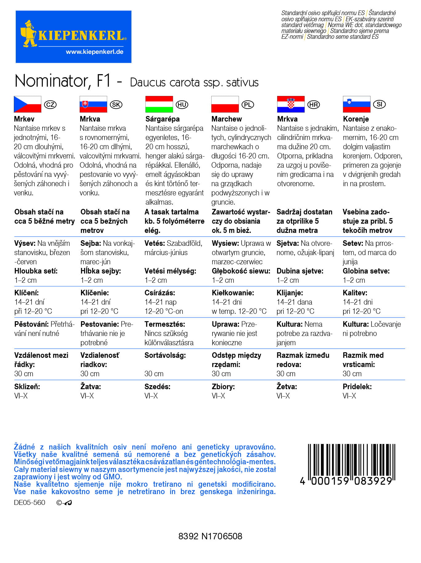 Marchew Nominator F1 to odmiana o jednolitych, cylindrycznych marchewkach o długości 16–20 cm, charakteryzująca się odpornością na zmienne warunki. Doskonale nadaje się do uprawy na grządkach podwyższonych oraz w gruncie.